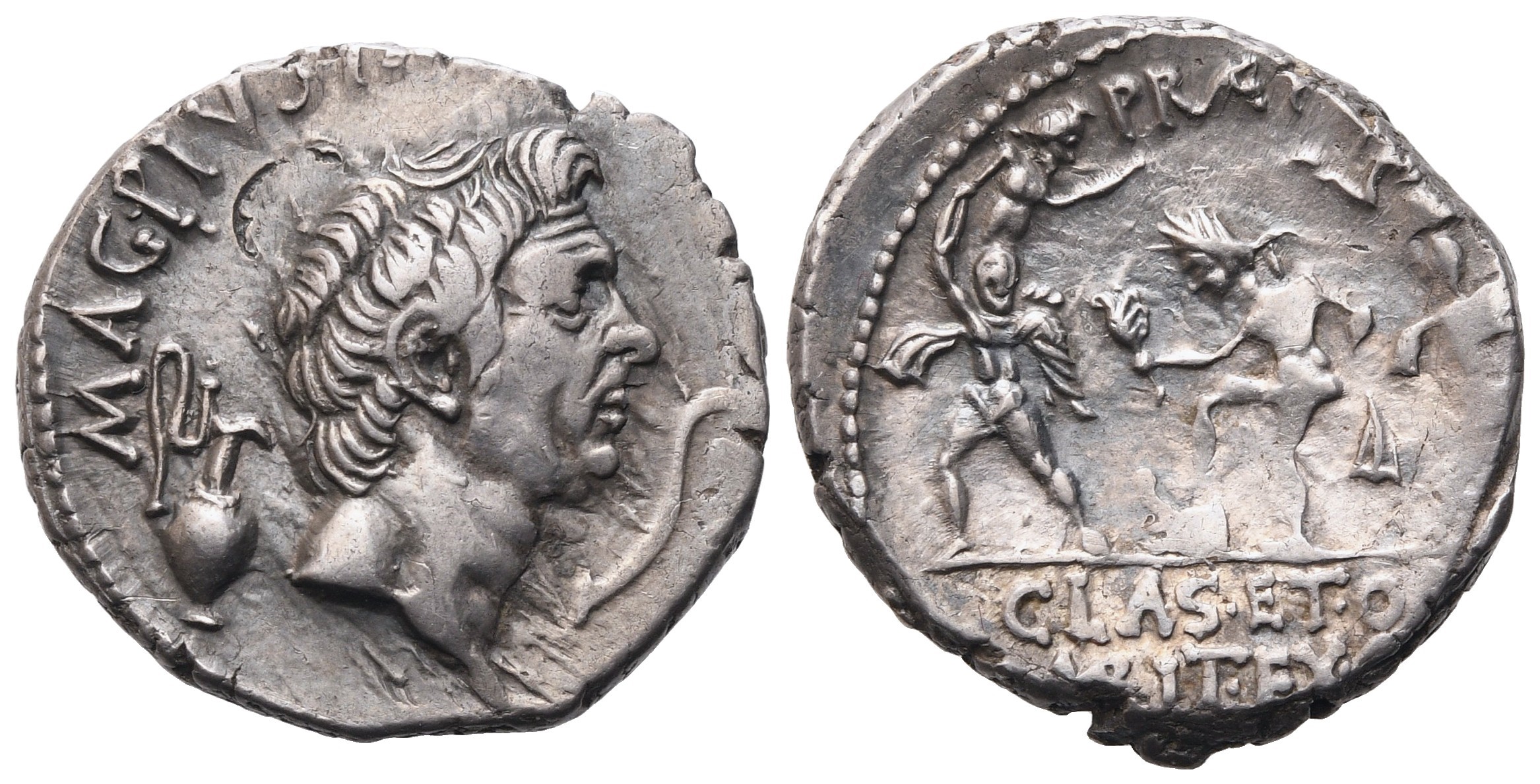 Uncertain mint in Sicily. Head of Cn. Pompeius Magnus r.; behind, jug; before, lituus; around, MAG·PIVS·I[MP·ITER]; Rv. Neptune standing l., wearing diadem, holding aplustre in r. hand and cloak over l. arm; placing r. foot on prow; on either side, one of the Catanaean brothers, bearing his father on his shoulders; above, PRAEF; in exergue, CLAS·ET·O[RAE] / [MA]RIT EX [SC]. Crawford 511/3a; Babelon (Pompeia) 27; Sydenham 1344. About extremely fine.