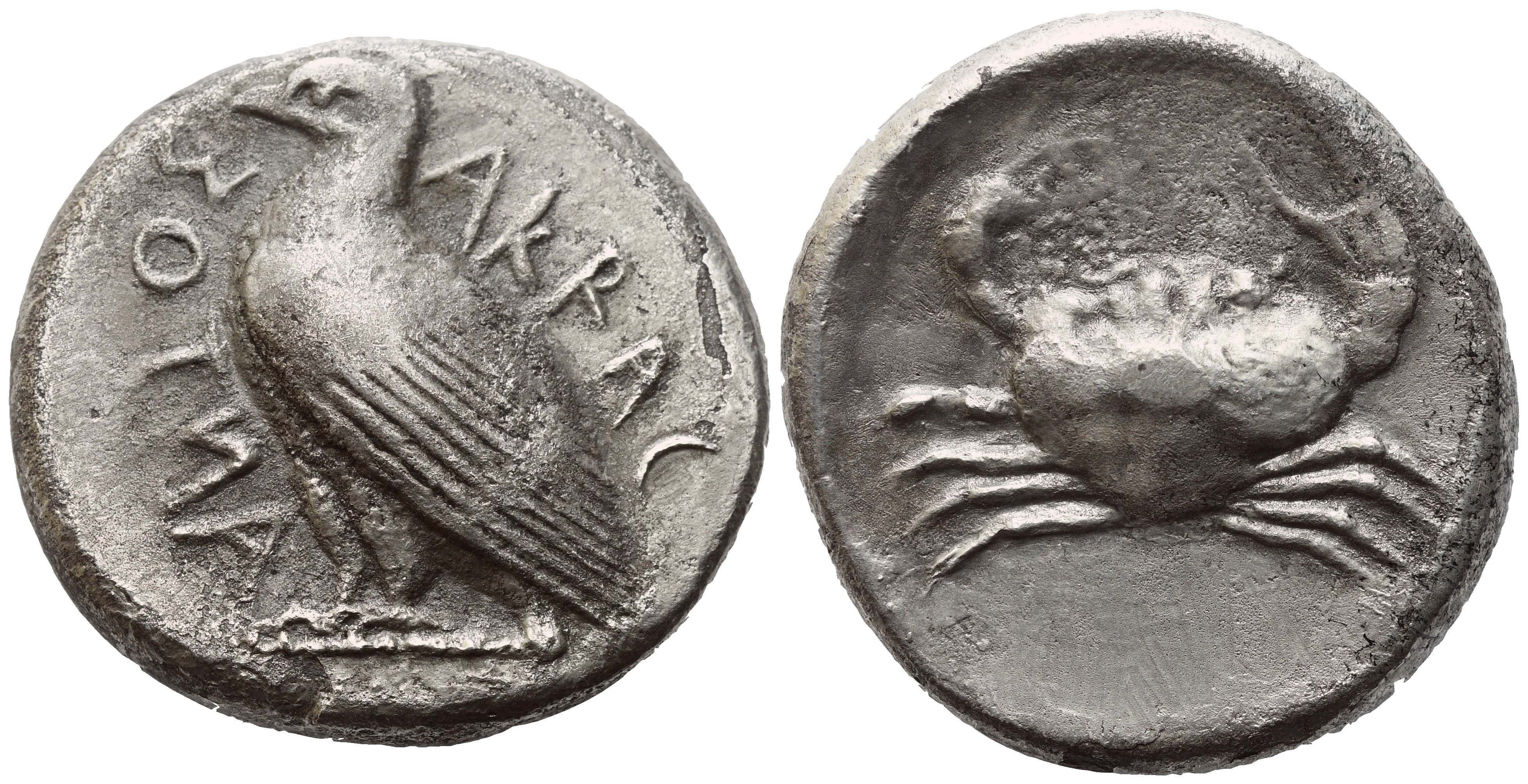 AKPAC-ANTOΣ (retr.) Eagle standing l., with closed wings, Rv. Crab within incuse square. SNG Copenhagen 41 SNG ANS 976-978.Pleasing cabinet tone. Good very fine.