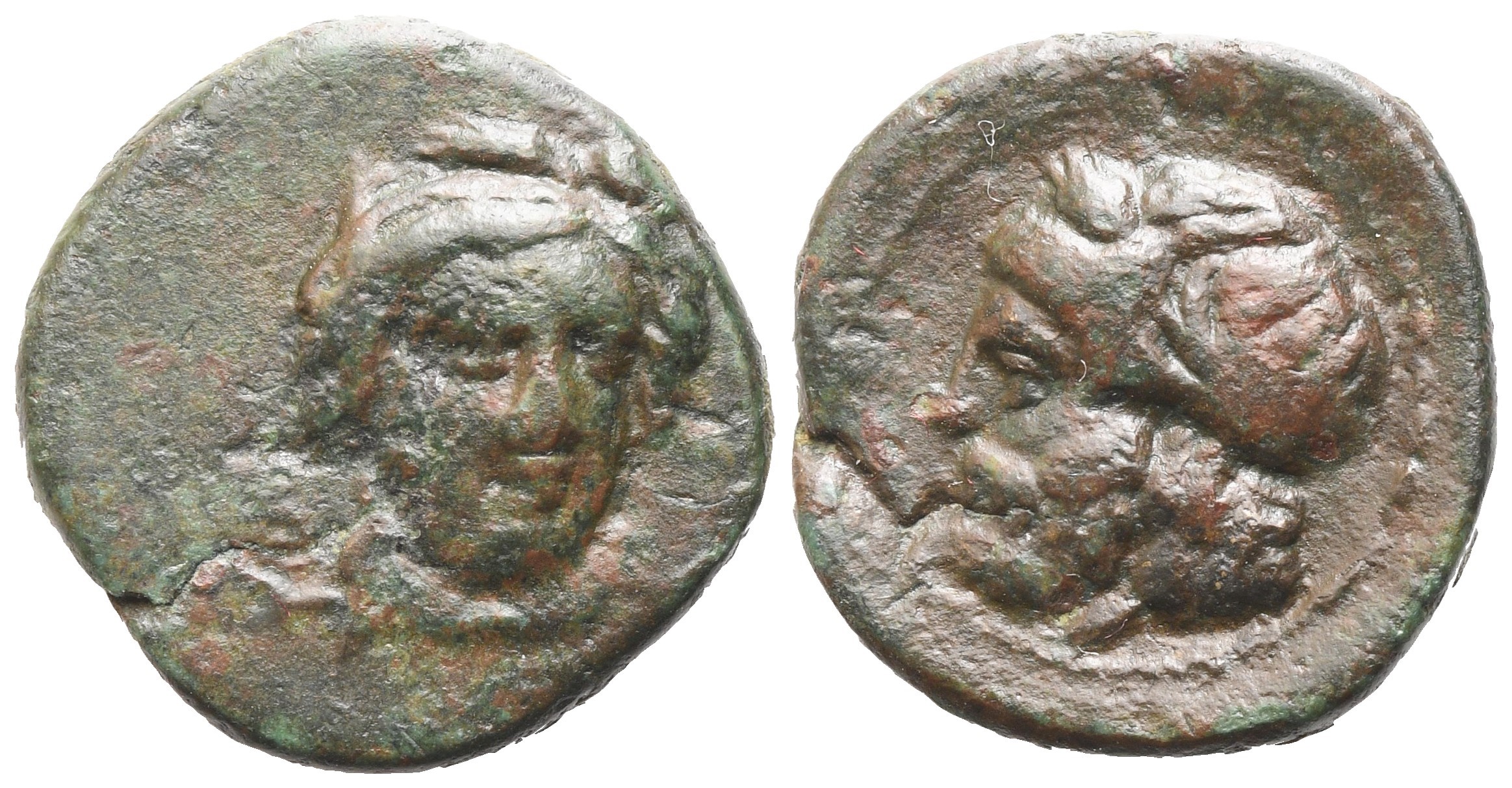 [ΓΕΛΩΙΩΝ] Head of Demeter facing slightly to right, wearing necklace and wreath with corn ears. Rev. Bearded head of Gelas to left, wearing wreath of grain ears.Jenkins 1970, Gela Group XII, 282, 549-550. Calciati, CNS III, 29-30, 59. HGC 2, 388. SNG Morcom 591. SNG ANS 123-125. Dark green patina with red highlights. Good very fine.