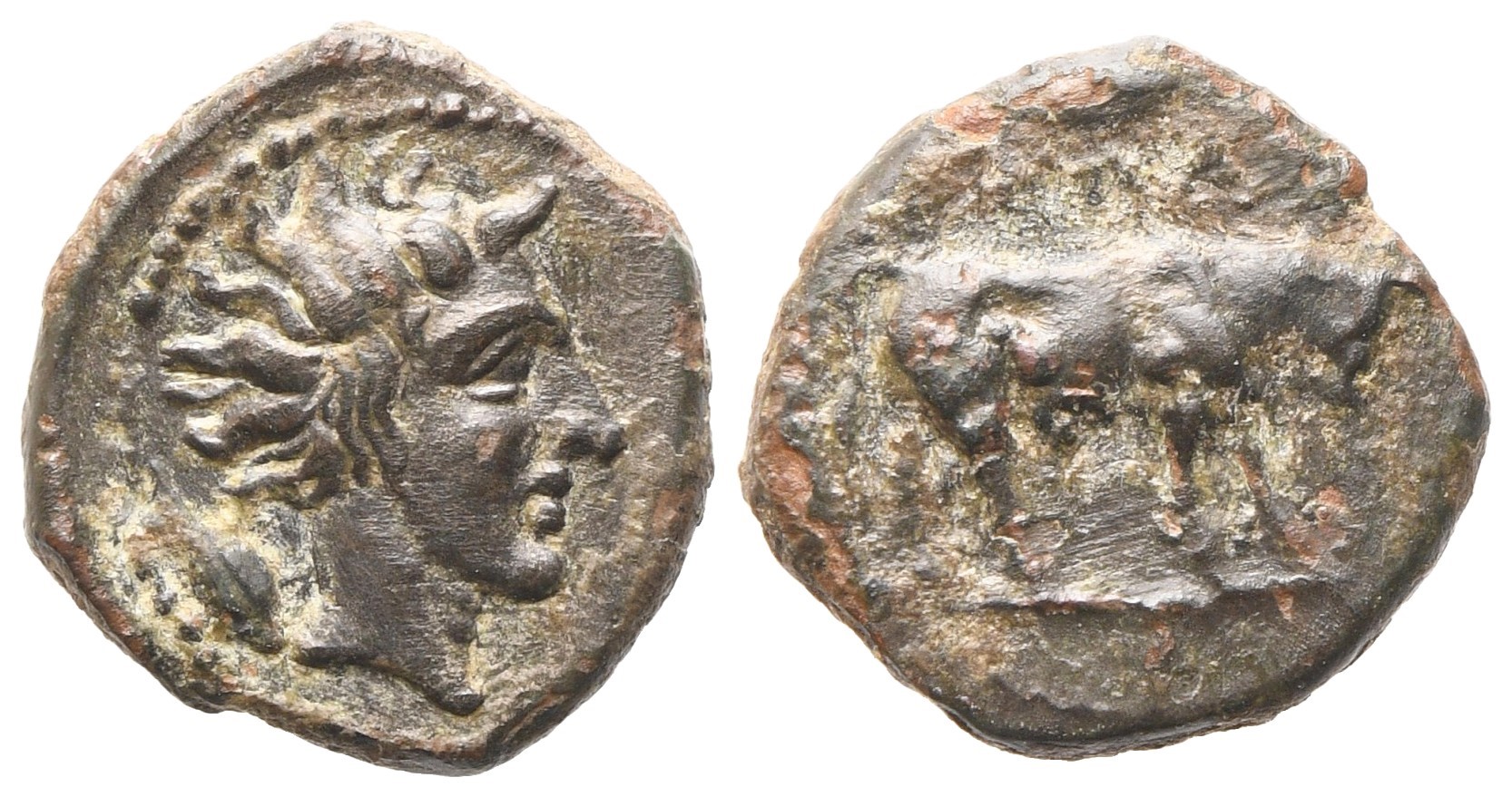 Head of river-god r., grain in l. field, grain; Rv. Bull standing r., ΓEΛAΣ above, pellet in exergue. Jenkins 509; Calciati 22. Brown patina with lighter hues. gVF
