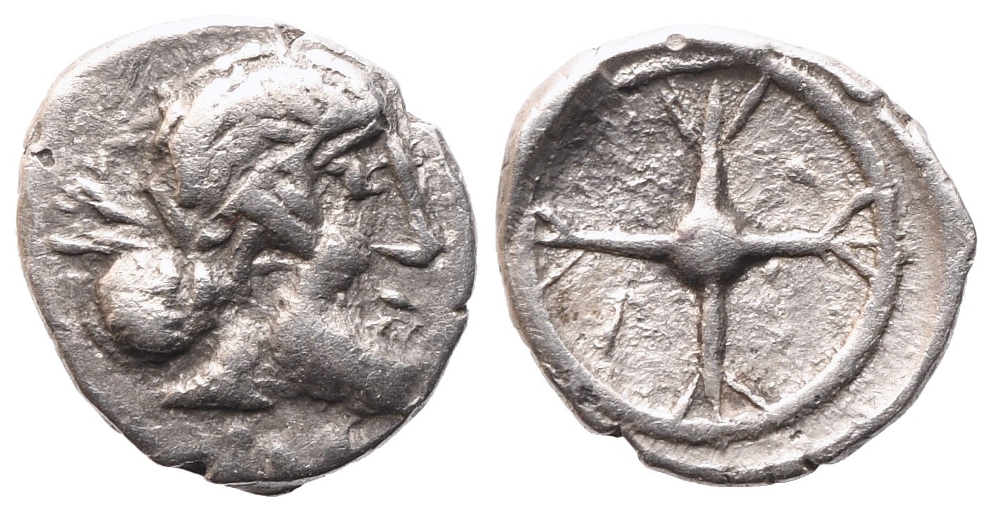 Pearl-diademed head of Arethusa r.; Rv. Anepigraphic, four-spoked wheel. Cf. Boehringer 362-373. VF