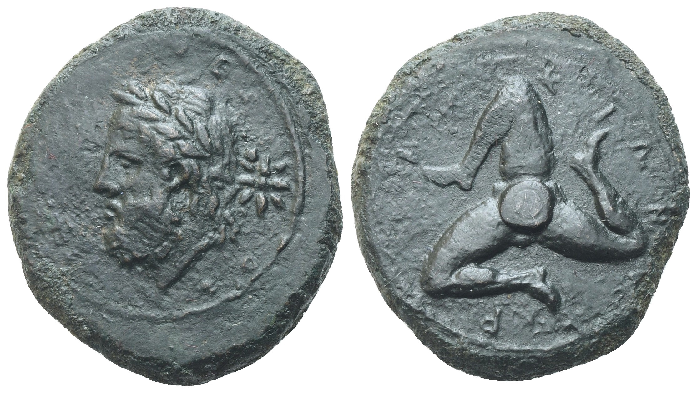 ZEYΣ EΛEYΘEPIOΣ, bearded and laureate head of Zeus Eleutherios l.; on l., star, Rv. ΣYP - AKOΣIΩN, triskeles. CNS 82; SNG Copenhagen 732; SNG ANS 544. Very rare. Dark green patina. About extremely fine.