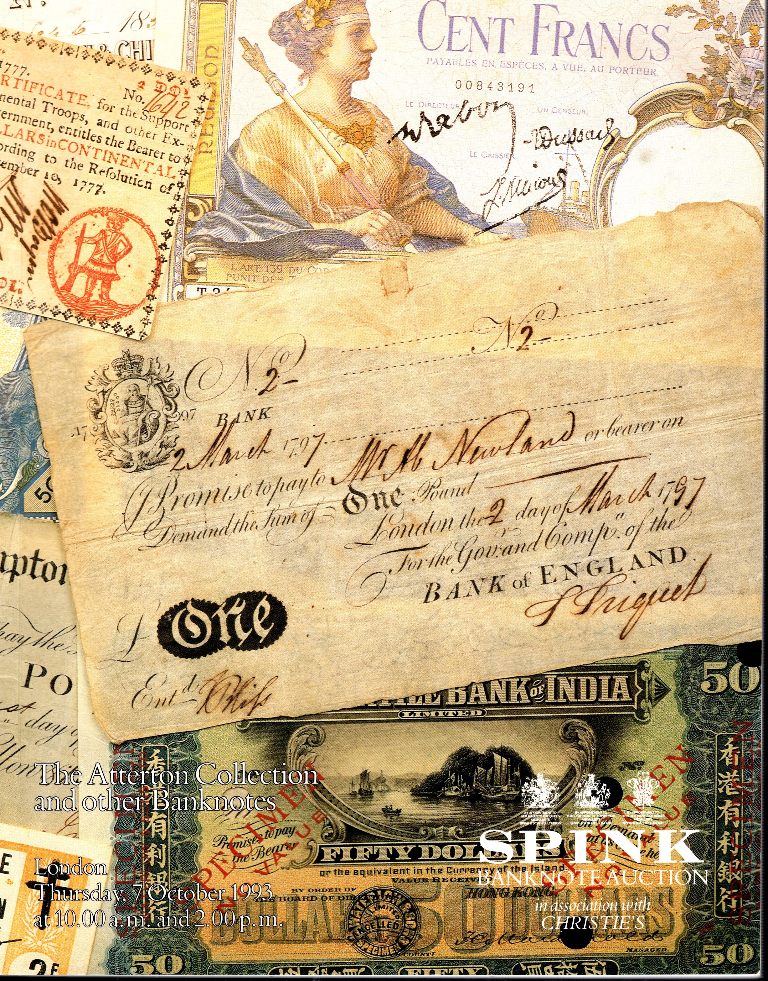 SPINK COINS - CHRISTIE'S. - London, 7 - October, 1993. The Atterton collection and other Banknotes. Pp 165, nn. 938, tavv. 93. ril. ed. ottimo stato. importante collezione di Banconote mondiali.