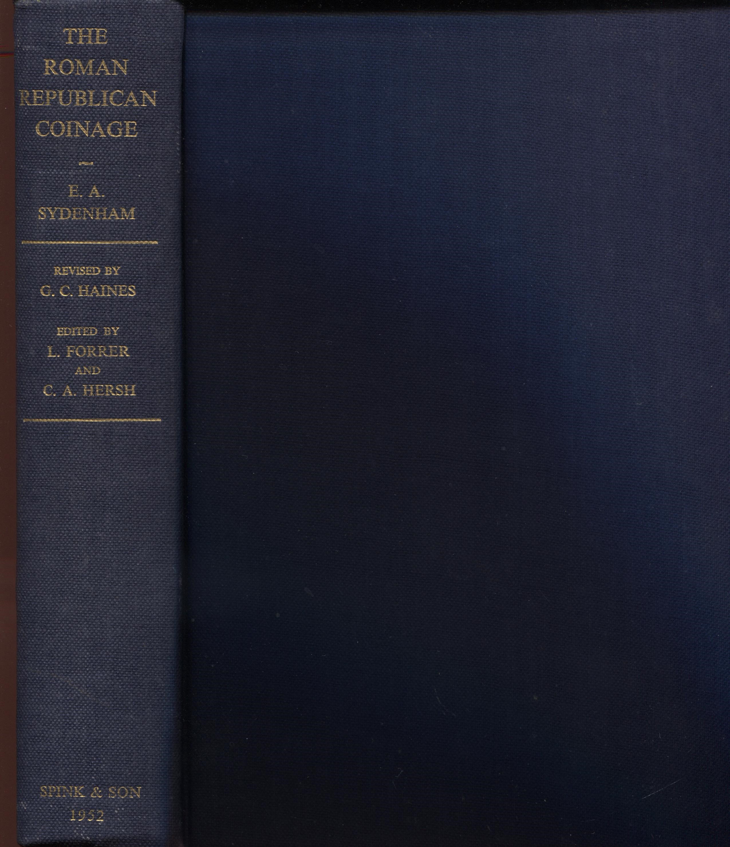 SYDENHAM E. β The coinage of the Roman Republic. London, 1952. Pp. lxix, 343, plates 30. Rel. Ed. canvas with writings. Good condition, rare.