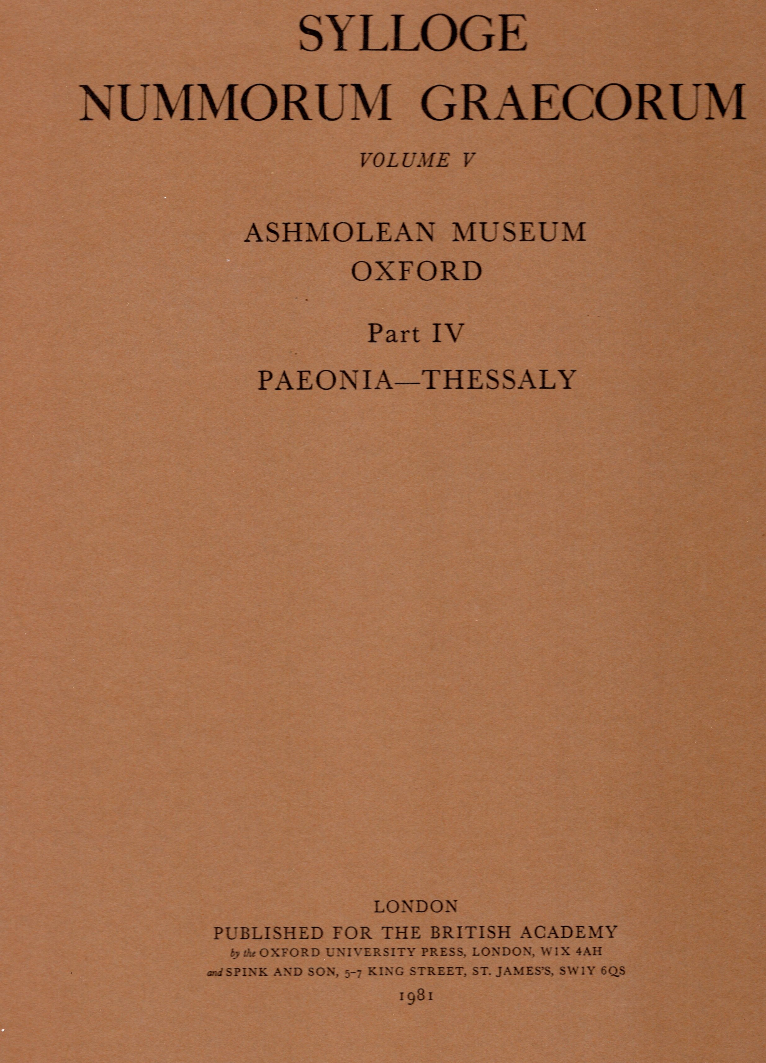 SYLLOGE NUMMORUM GRAECORUM. Vol. V. Ashmolean Museum Oxford. London, 1981. Part IV Paeonia - Thessaly. Tavv. da LXIX a LXXXII. Rilegatura editoriale, ottimo stato.