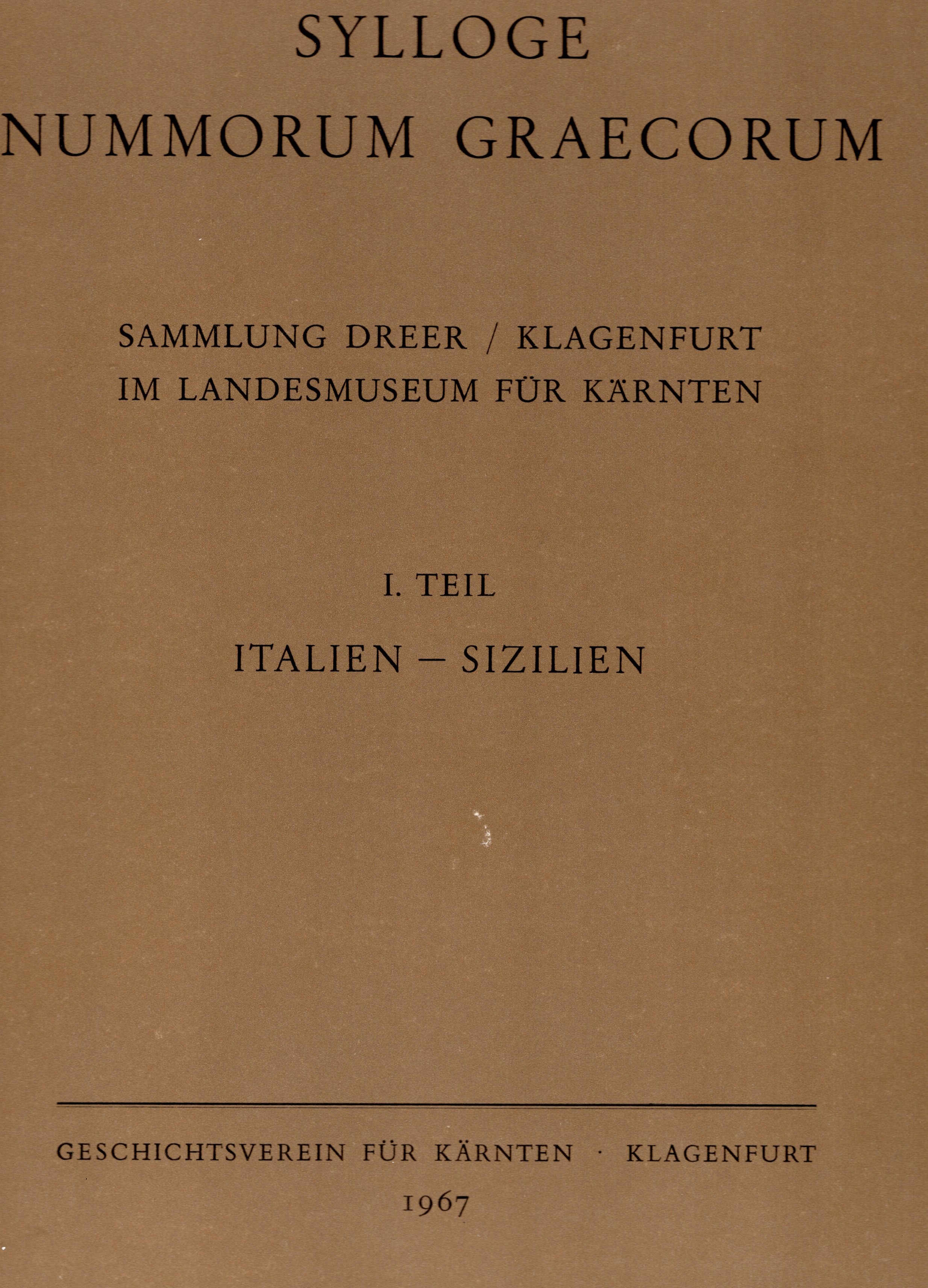 SYLLOGE NUMMUMMORUM GRAECORUM. Sammlung Dreer \ Klagenfurt im Landesmusum fur Karnten. Klagenfurt, 1967. I Teil. Italien β Sizilien. Pp.12, + foglio concordanze. tavv. 15. Rilegatura editoriale ottimo stato, raro e importante. 612 monete descritte e illustrate