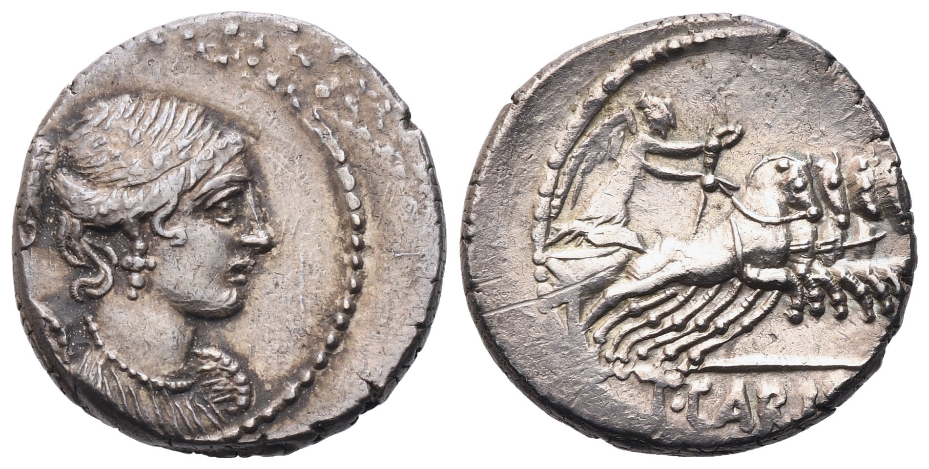 Draped and winged bust of Victory right; [S·C] behind; Rv. Victory driving galloping quadriga r., holding wreath and reins; T·CARI[SI] in exergue. Crawford 464/5; Babelon (Carisia) 3; Sydenham 985. gVF