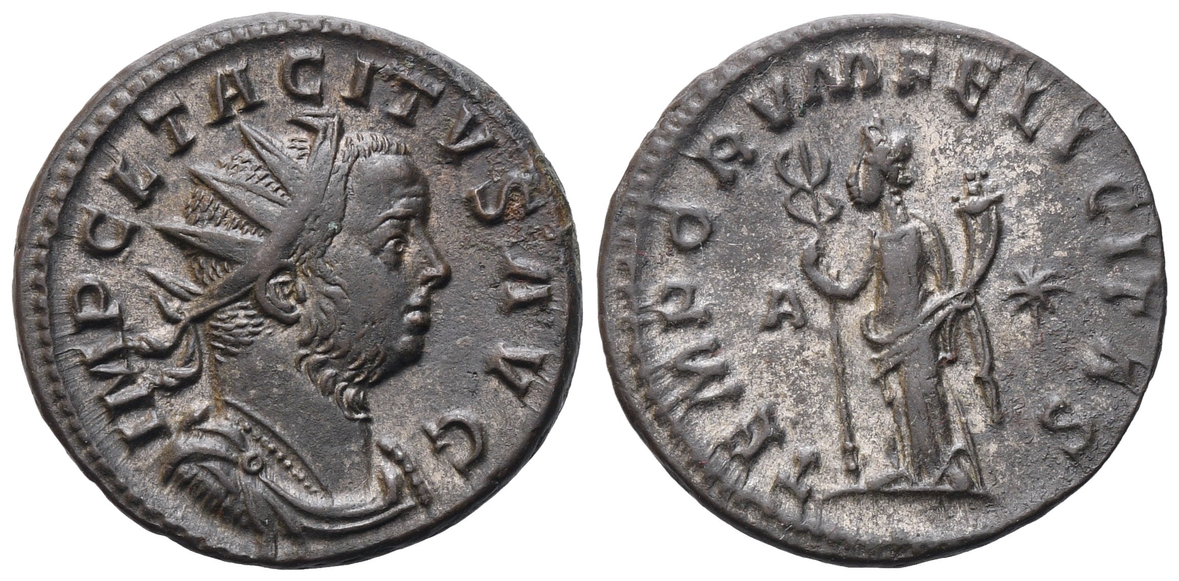IMP CL TACITVS AVG Radiate, draped and cuirassed bust of Tacitus r.; Rv. TEMPORVM FELICITAS Felicitas standing facing, head left, holding caduceus in her r. hand and cornucopiae in her left hand; in l. field, Δ; in right field, ✱. - RIC V.1, 65. RIC temp. 3340. EF / aEF
