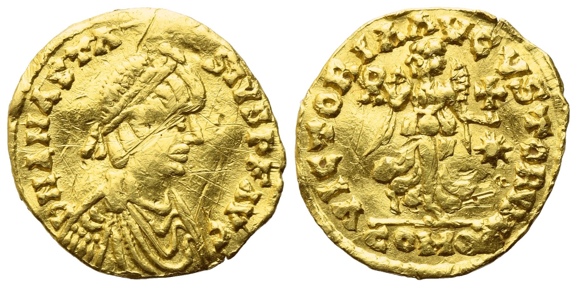 D N ANASTAS-IVS PP AVG, pearl-diademed, drapeded and cuirassed bust of Anastasius right; Rv./ VICTORIA AVGVSTORVN, Victory advancing to right, head, in right hand holds wreath, in left hand a globe cruciger, star in right field; COMOB in exergue. MIB I 10-11. MEC I 114-116. Metlich 13. A few scratches, otherwise gVF. Rare.