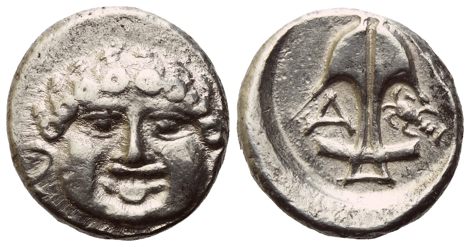Facing gorgoneion; Rv. Upright anchor; A to l., crayfish to right. SNG BMC Black Sea 157; HGC 3.2, 1323. SNG Copenhagen 452. VF