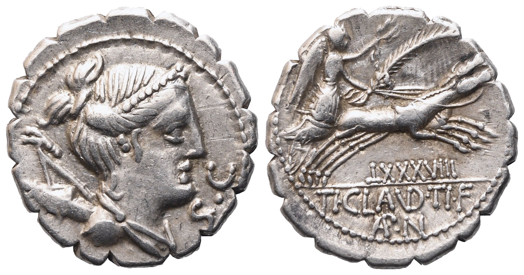 Diademed and draped bust of Diana to r., with bow and quiver over her shoulder; to right, S·C; Rv. Victory driving fast biga to r., holding wreath in her r. hand and palm frond and reins in her l.; below, LXXXVIII (control number); in exergue, TI·CLAVD·TI·F / AP·N. Crawford 383/1; Babelon (Claudia) 5; Sydenham 770. Extremely fine.