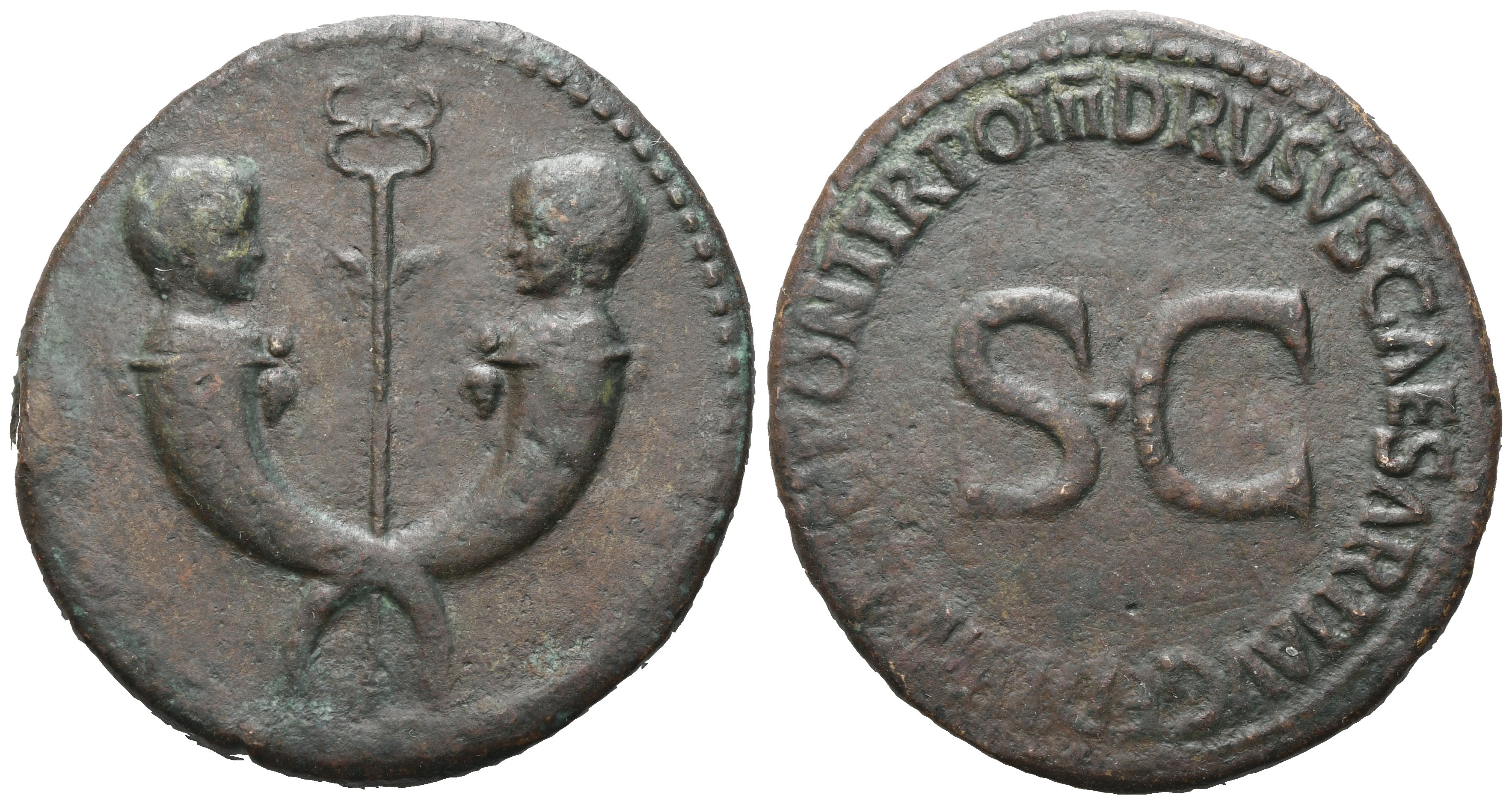 In the name of Drusus Julius Caesar, son of Tiberius. Confronting heads of Drusus's twin sons on crossed cornucopiae, winged caduceus between; Rv. DRVSVS CAESAR TI AVG F DIVI AVG N PONT TR POT II around large S C. RIC I 42 (Tiberius). Dark brown patina. gVF