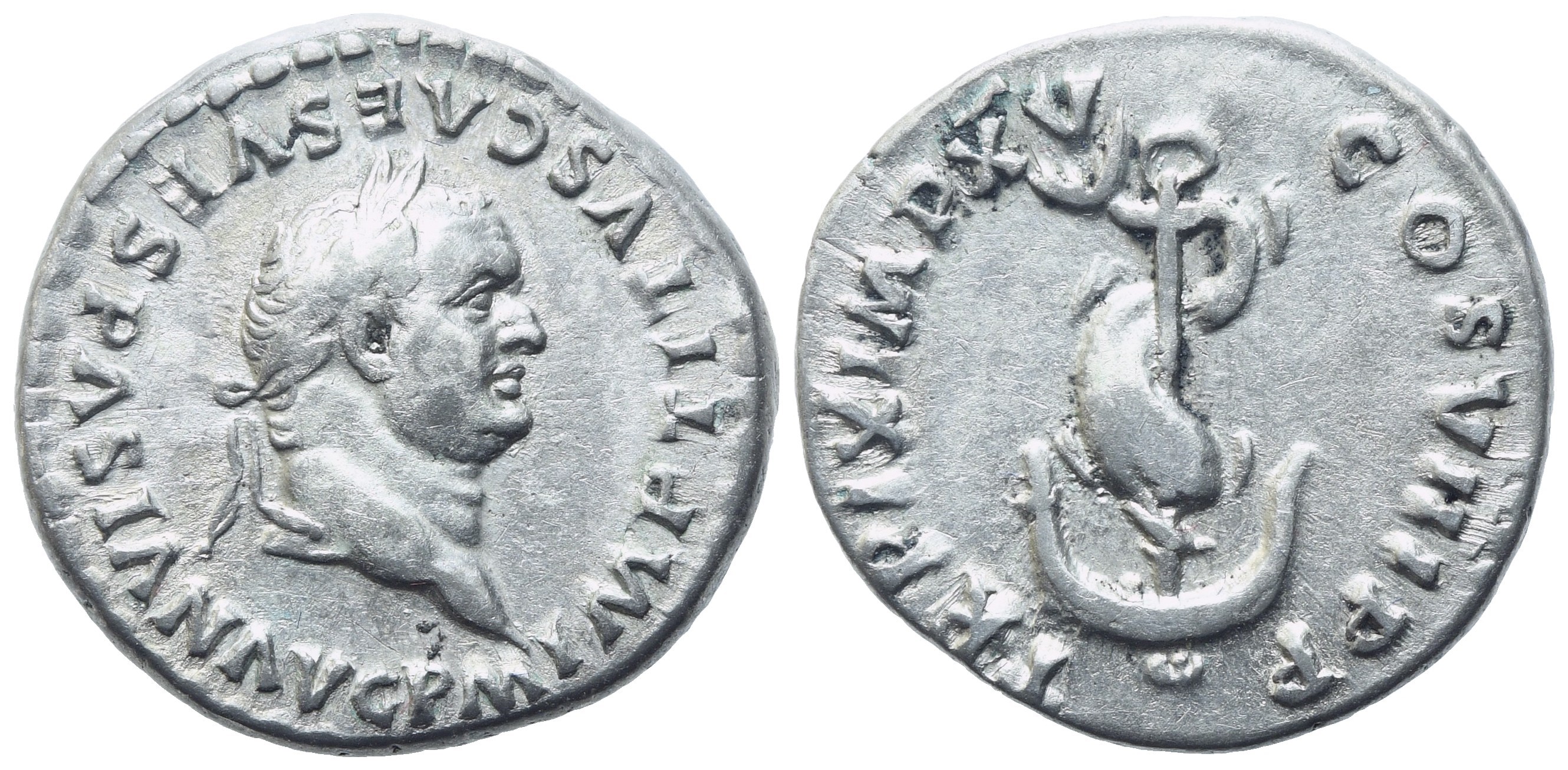 IMP TITVS CAES VESPASIAN AVG P M Laureate head r.; Rv. TR P IX IMP XV COS VIII P P Dolphin coiled around anchor. RIC II 26a; BMCRE 72; RSC 309. Near extremely fine.
