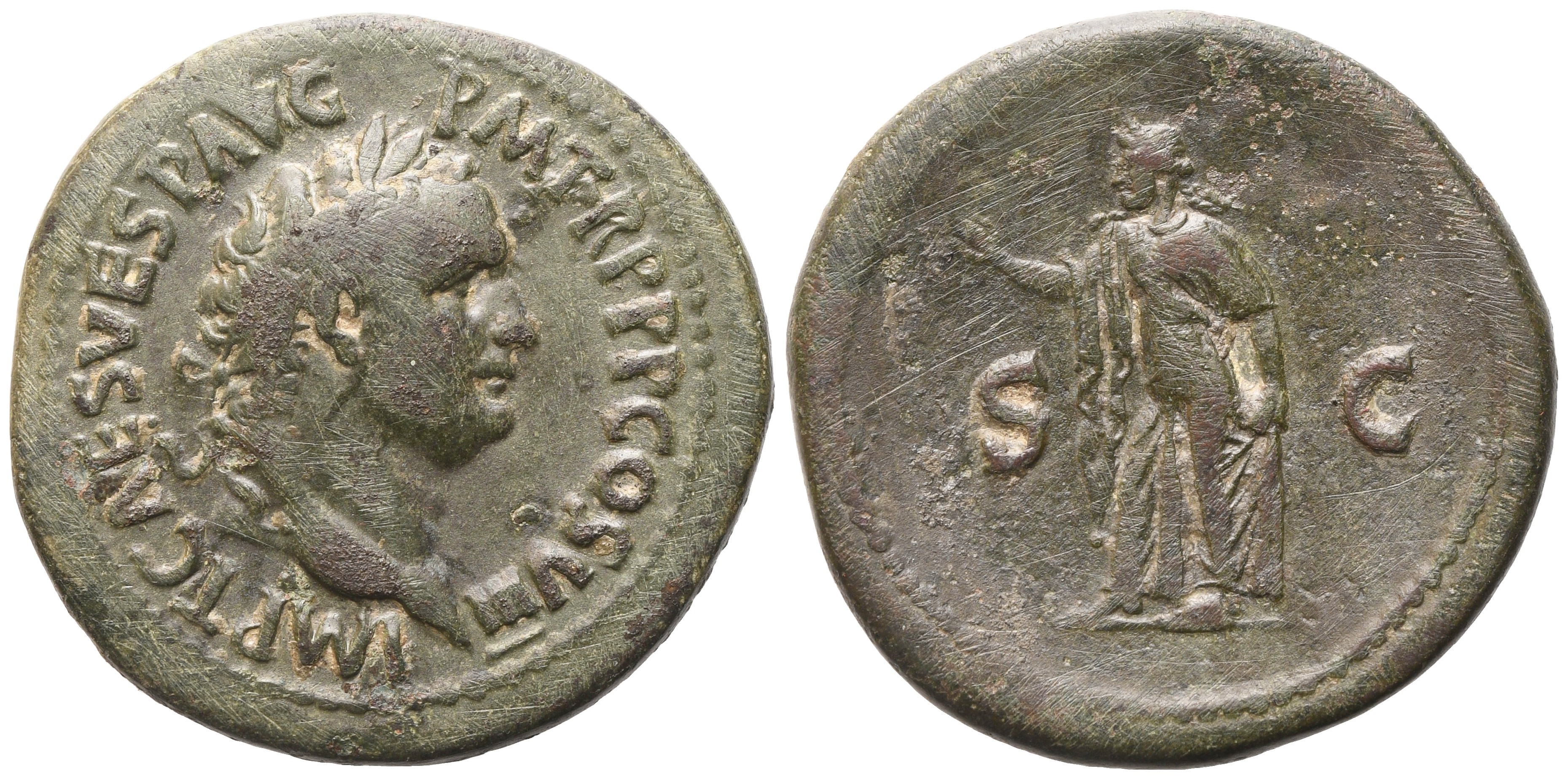 IMP T CAES VESP AVG P M TR P P P COS VIII Laureate head r. Rx: S - C Spes advancing l. holding flower and raising skirt. RIC 168. Greenish brown patina. VF