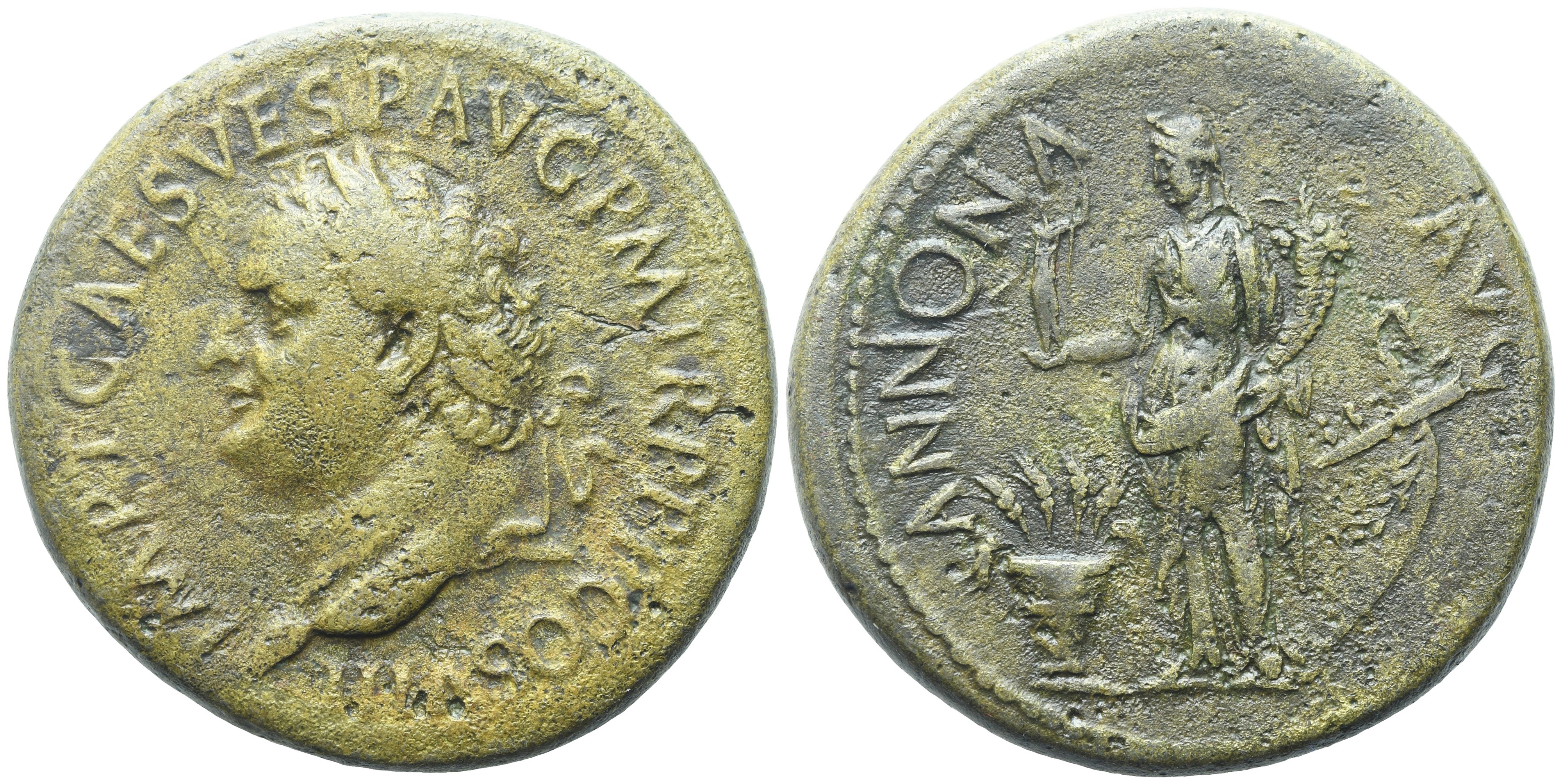 IMP T CAES VESP AVG PM TR P PP COS VIII Laureate head l.; Rv. ANNONA AVG legend with Annona standing l., holding statuette of Aequitas and cornucopia; modius with corn-ears in left field, stern of ship in right field. RIC 137; Cohen 15; BMC 153-155. Attractive green patina. Some corrosion, overall good very fine.