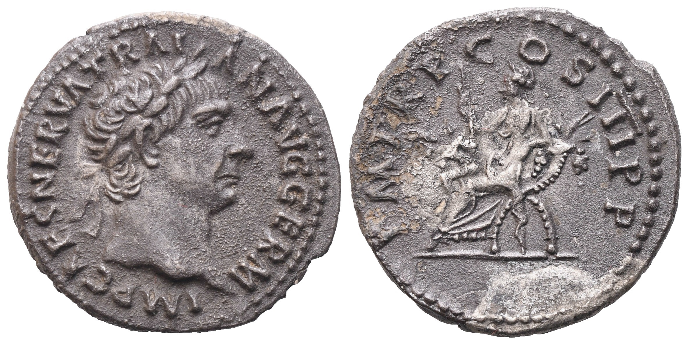 IMP NERVA CAES TRAIAN AVG GERM Laureate head r.; Rv. P M TR P COS III P P Abundantia seated l., holding sceptre, on chair with crossed cornucopiae as arms, fold of drapery over her lap. RIC 32; RSC 219; BMC 68. Rough surfaces, otherwise almost gVF