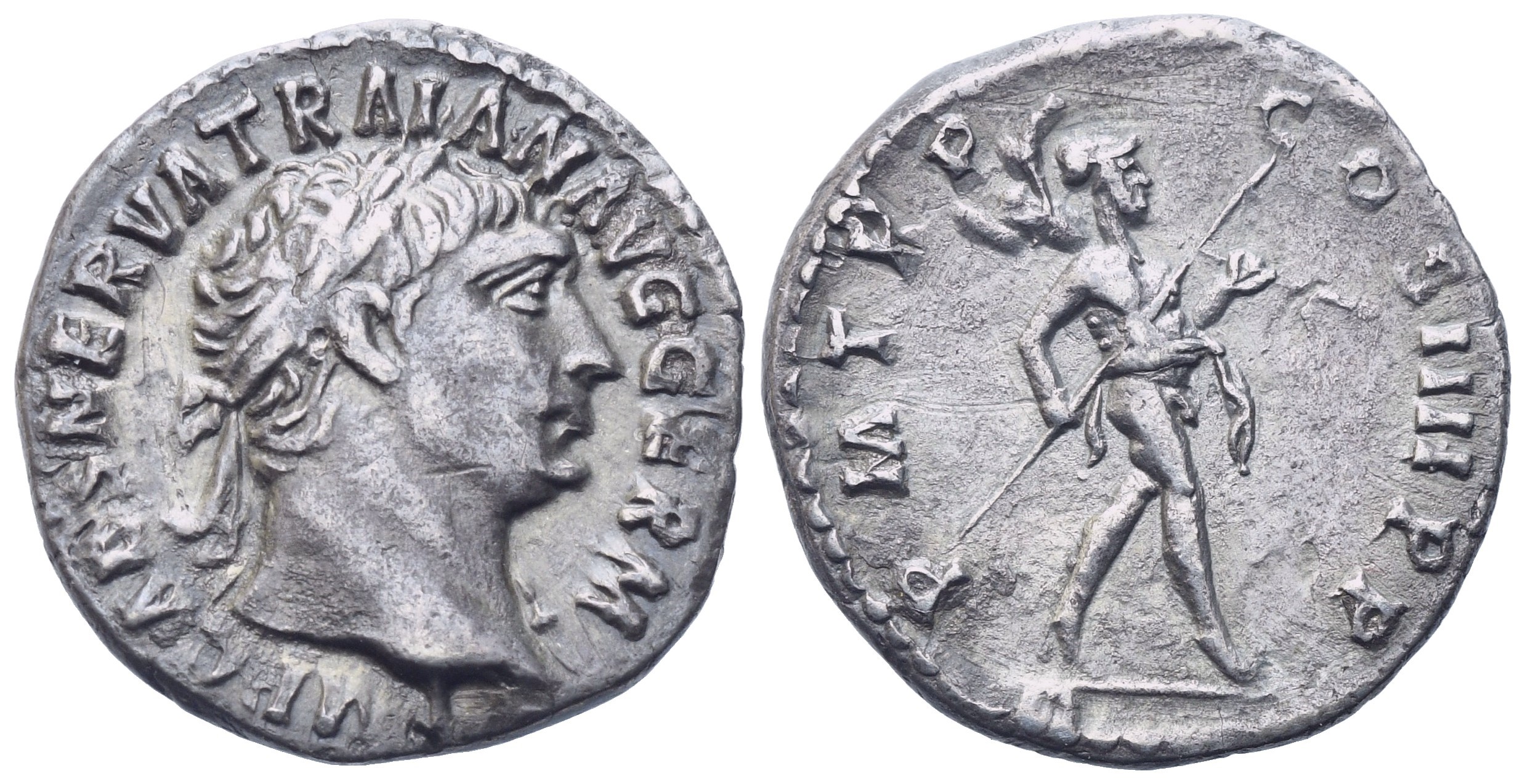 IMP CAES NERVA TRA-IAN AVG GERM Laureate bust of Trajan r., with drapery visible of left shoulder; Rv. P M TR P COS IIII P P Mars, nude, advancing r., with transverse spear in r. hand, trophy in l. against l. shoulder. RIC II 52. Near extremely fine.