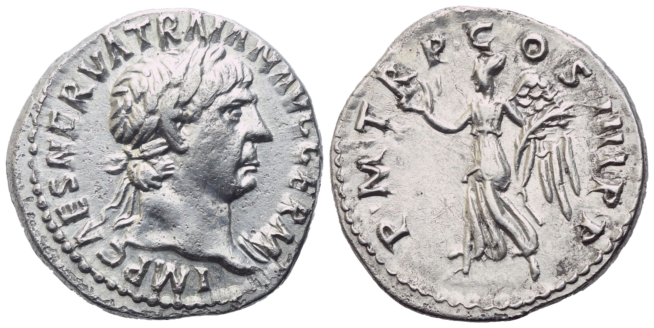 IMP CAES NERVA TRAIAN AVG GERM Laureate head to r., slight drapery on far shoulder.; Rv. P M TR P COS IIII P P Victory walking to l., holding palm and wreath. RIC 60. Extremely fine.