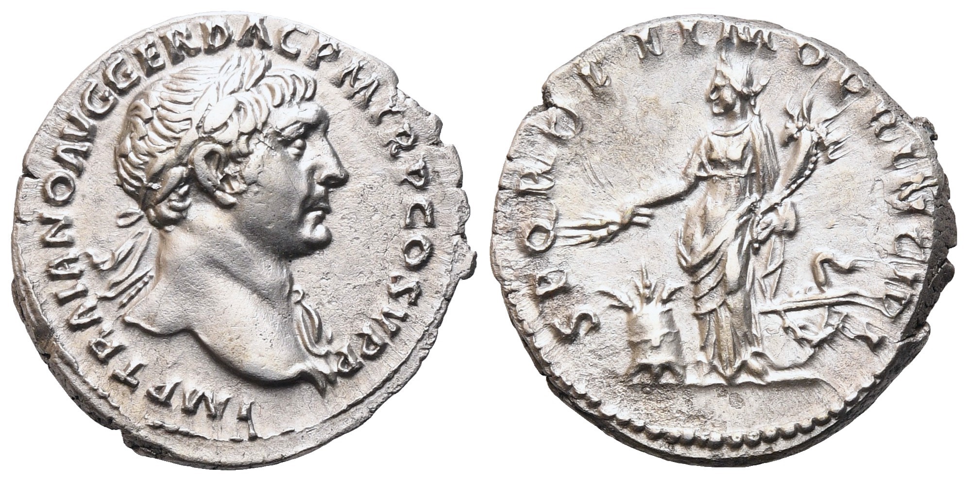 IMP TRAIANO AVG GER DAC P M TR P COS V P P Laureate bust r., with aegis; Rv. SPQR OPTIMO PRINCIPI Abundantia standing l., holding cornucopia and grain ears over modius to l.; prow to r. RIC 165. Extremely fine.