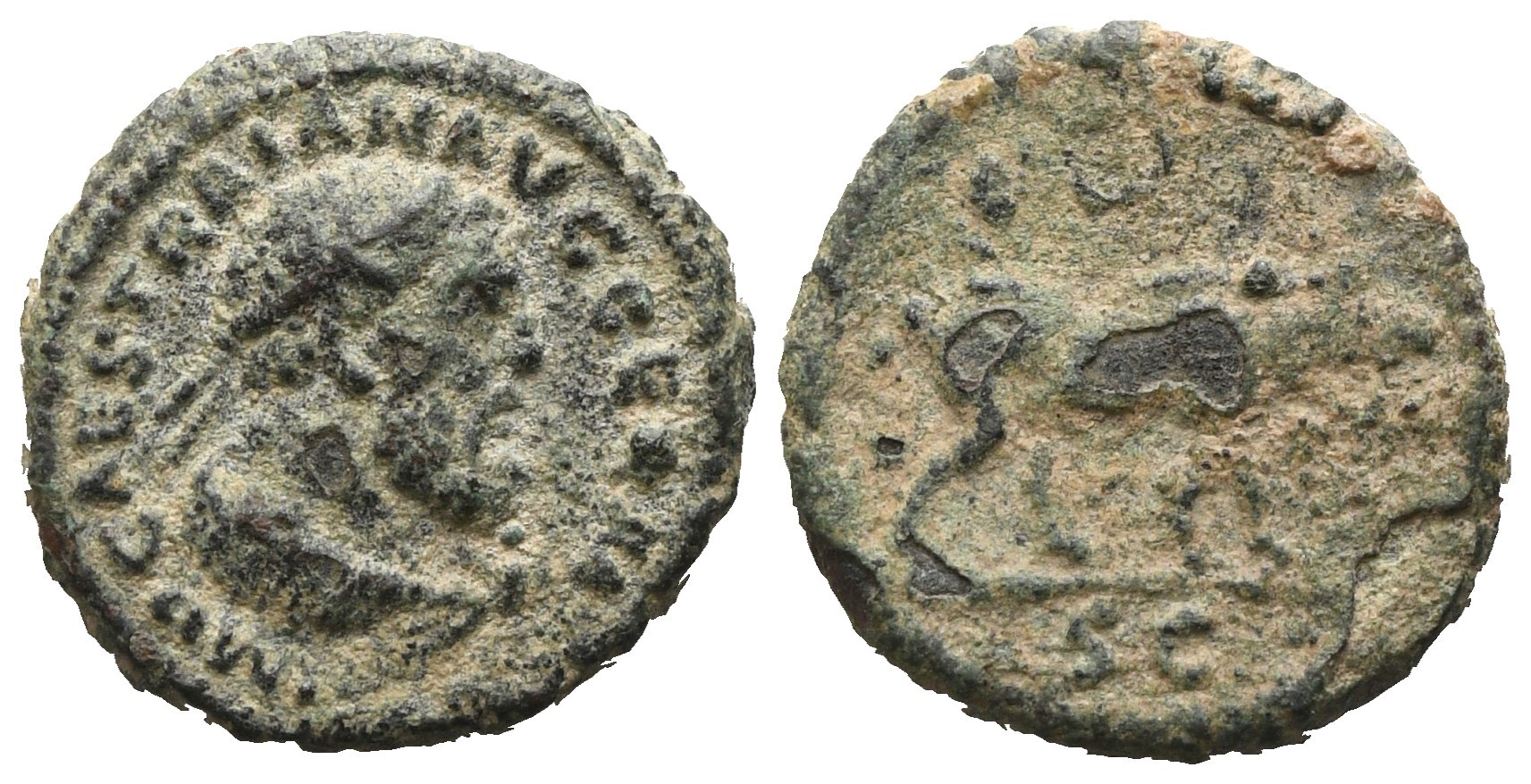 IMP CAES TRAIAN AVG GERM Laureate bust of Hercules to r., wearing lion skin draped around his neck. Rev. S C Boar walking right. BMC 1062. Cohen 341. RIC 702. Woytek 602b. VF