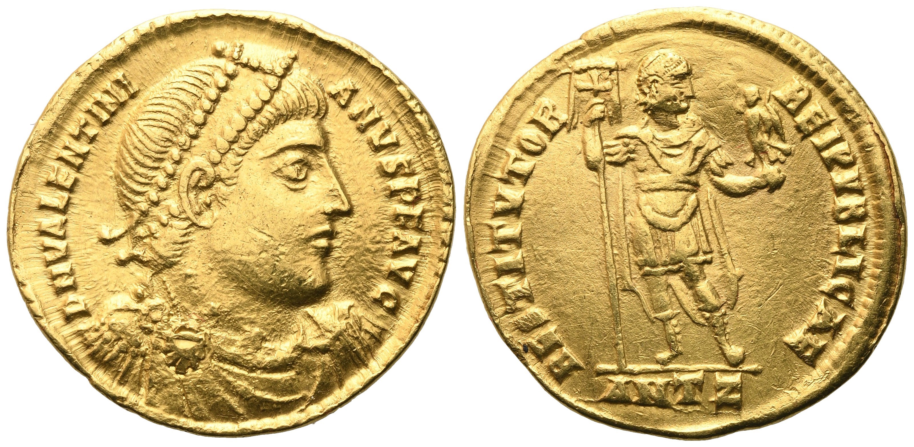 D N VALENTINIANVS P F AVG Ddiademed, draped and cuirassed bust r; Rv. RESTITVTOR REI PBVLICAE Emperor standing l. holding labarum and Victory on globe; ANT Z in exergue. RIC 2a; Cohen 28. Extremely fine.