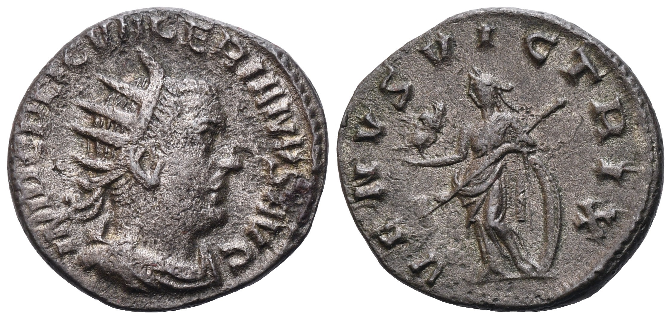 IMP C P LIC VALERIANVS AVG Radiate, draped and cuirassed bust r.; Rv. VENVS VICTRIX Venus standing l., holding helmet and transverse spear, leaning on shield set on ground r. RIC V-222 (Viminacium); MIR-1573a; RSC-212 (Viminacium). VF