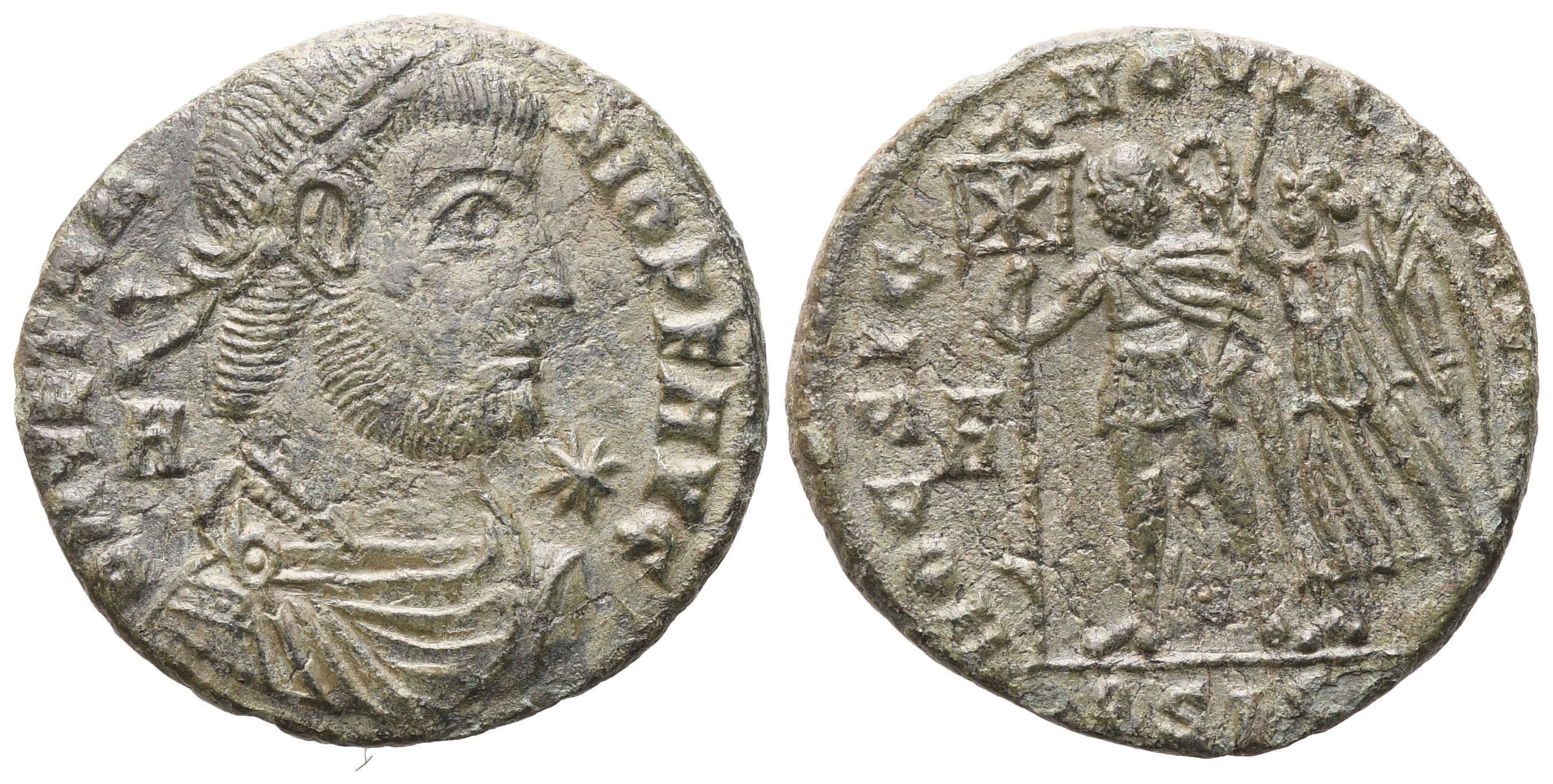 D N VETRANIO P F AVG Laureate, draped and cuirassed bust r.; A behind; to r., star; Rv. HOC SIGNO VICTOR ERIS Emperor standing l., holding labarum and spear, being crowned with wreath by Victory standing; A in l. field. Ex. .ASIS*. RIC VIII, Siscia, 285. Good very fine.