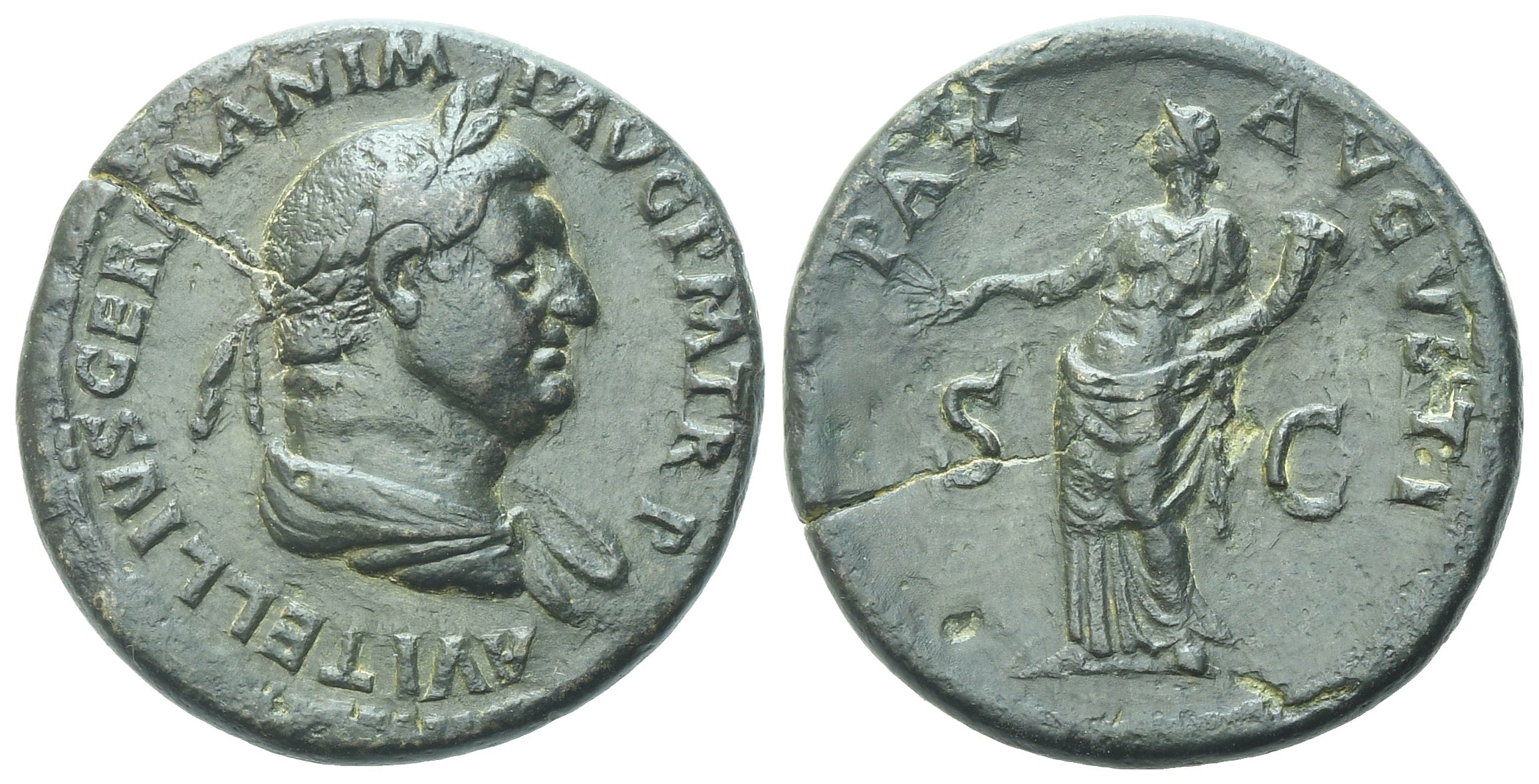 A VITELLIVS GERMAN IMP AVG PM TR P Laureate and draped bust r.; Rv. PAX AVGVSTI / S β C Pax standing l., holding olive-branch and cornucopia. RIC 140; Cohen 68. Heavy deep greenish-brown patina.
