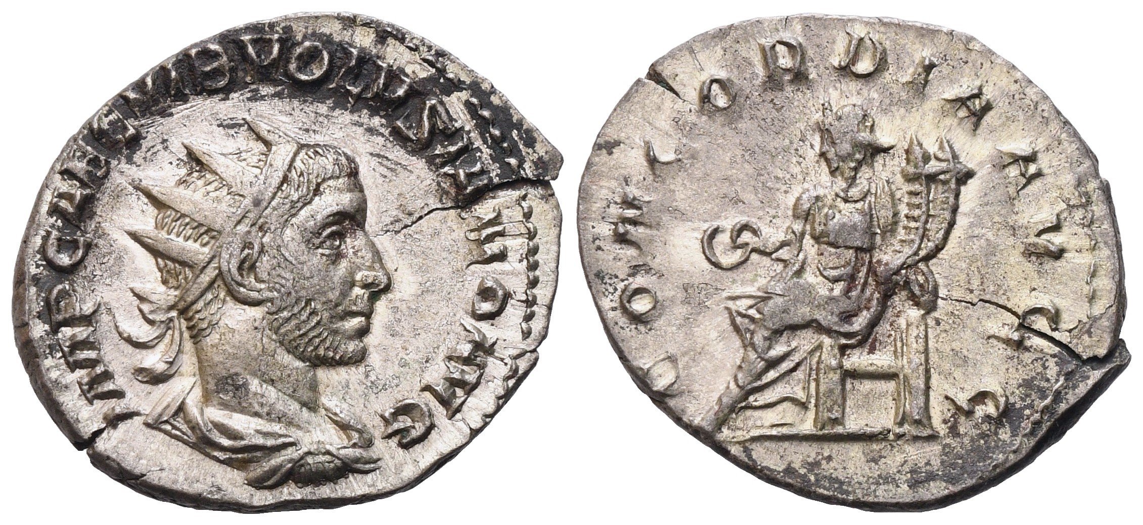 IMP CAE C VIB VOLVSIANO AV Radiate, draped and cuirassed bust of Volusian r.; Rv. CONCORDIA AVGG Concordia seated l., holding patera and double cornuacopiae; star to right. RIC 169; RSC 25a. Good very fine.